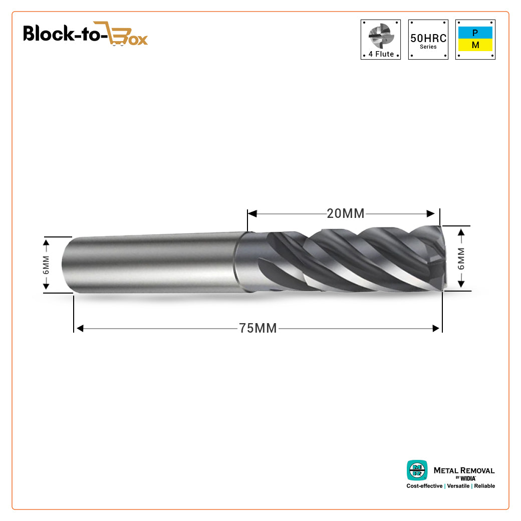 MRW Long Solid Carbide Square Endmills 4 Flute HRC 65 Cut Dia 6MM Shank Dia 6MM Flute Length 20MM OAL 75MM Coated